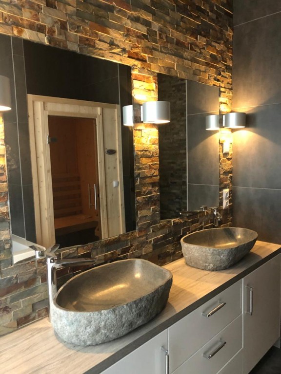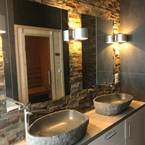 - 1 master bedroom met king size bed, elektrische openhaard & een en suite luxe badkamer (2-persoons jacuzzi, 2-persoons douche met sunshower, sauna, dubbele wastafel, toilet en urinoir)
