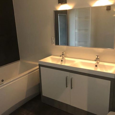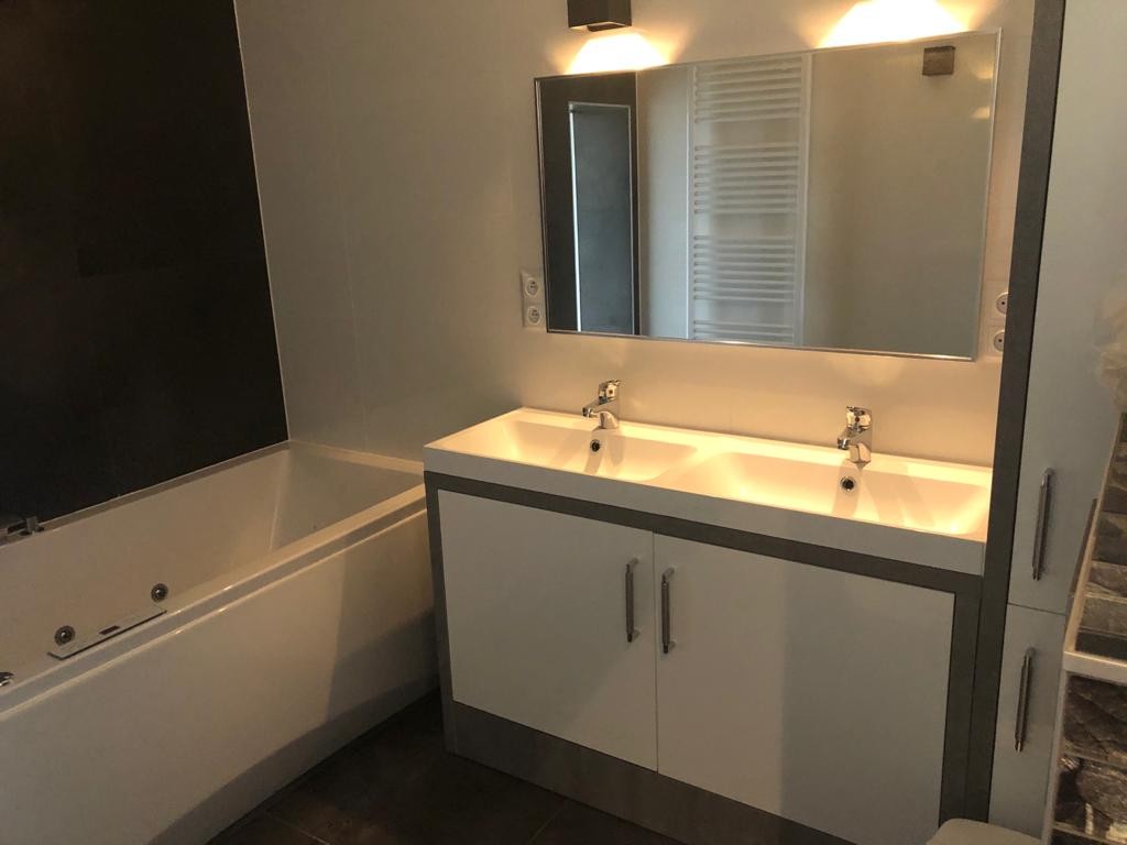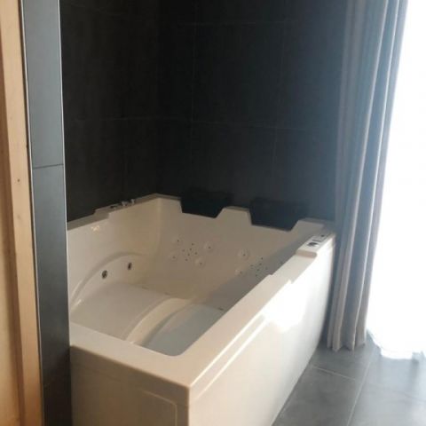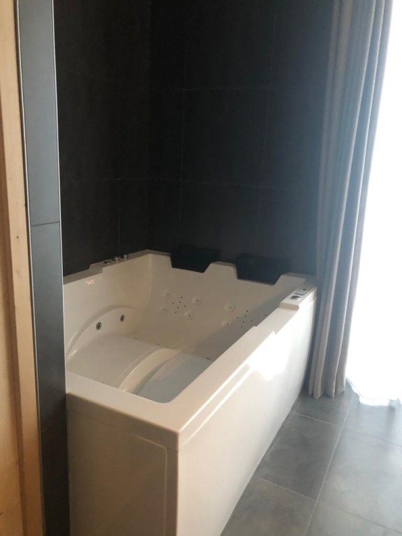 - 1 badkamer met jacuzzi ligbad, dubbele wastafel, toilet en urinoir